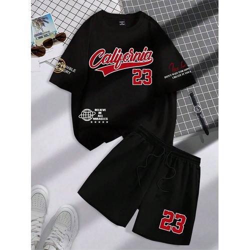 The top is a soft, breathable T-shirt with cool “California” lettering and the number “23” – it’s got that trendy, sporty vibe. The shorts match perfectly, also with “23” on them, and they’re made of light material that keeps you cool even on hot days.